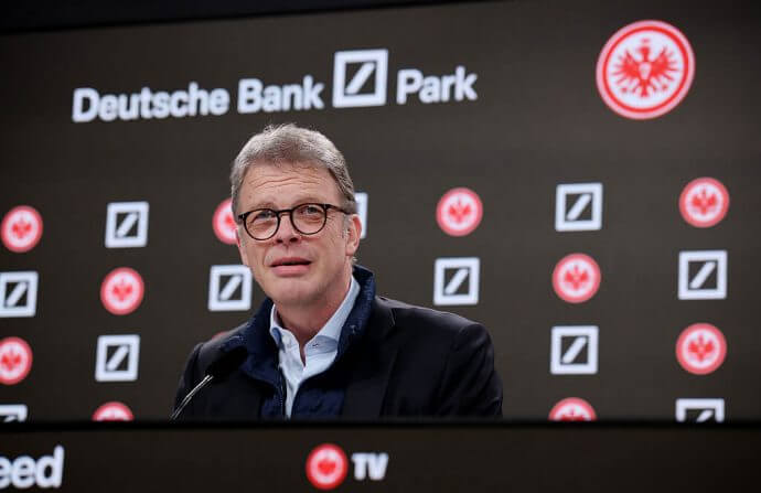 Christian Sewing, Vorstandsvorsitzender der Deutschen Bank, spricht während einer Pressekonferenz mit den Medien, nachdem die Deutsche Bank die Verlängerung ihrer Partnerschaft mit Eintracht Frankfurt bekannt gegeben hatte – im Vorfeld des Bundesliga-Spiels zwischen Eintracht Frankfurt und Borussia Dortmund im Deutsche Bank Park am 9. Januar 2026 in Frankfurt am Main, Deutschland.GETTYIMAGES/Alex Grimm