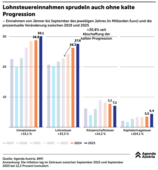 Die Regierung bereitet die Öffentlichkeit auf „notwendige“ höhere Steuern vor – doch die Zahlen erzählen eine andere Geschichte. Seit 2019 sind die Einnahmen aus Lohnsteuer und Umsatzsteuer um rund 33 Prozent gestiegen. Der Staat hat die Inflation also nicht nur mitgenommen, sondern kräftig zu seinem Vorteil genutzt. Selbst nach der Abschaffung der kalten Progression legte die Lohnsteuer seit 2022 nochmals um 20,8 Prozent zu, wie eine Auswertung der Agenda Austria zeigt.