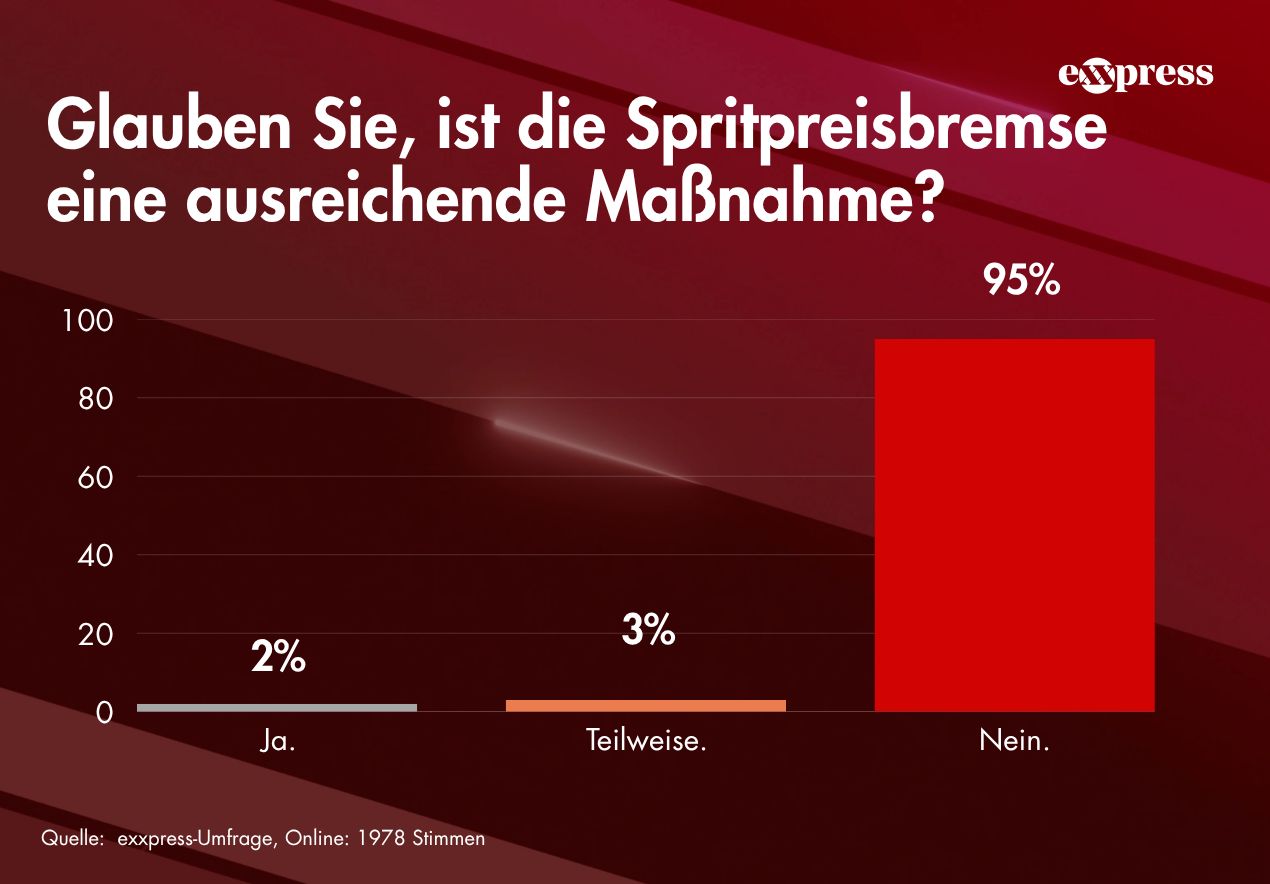 Hintergrund ist die angekündigte Maßnahme, wonach Autofahrer um rund zehn Cent pro Liter entlastet werden sollen. Insgesamt nahmen 1978 Leser an der Abstimmung teil. Das Resultat ist eindeutig: Ganze 95 Prozent halten die Maßnahme für nicht ausreichend. Nur zwei Prozent der Befragten sehen darin eine ausreichende Lösung, weitere drei Prozent bewerten sie als „teilweise sinnvoll“.