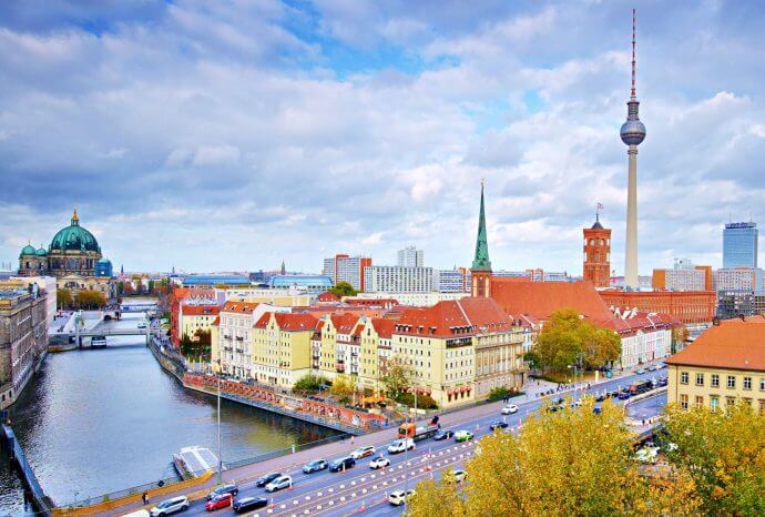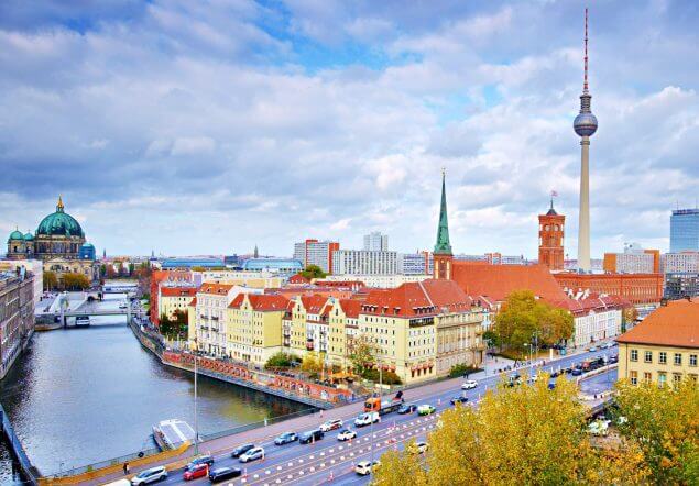 Blick auf das Berliner Regierungsviertel mit Rotem Rathaus und Fernsehturm: Die Stadtregierung aus CDU und SPD plant ein Gesetz, das Enteignungen von Wohnungs- und Infrastruktur-Unternehmen ermöglichen soll – bei „Klimaziel-Verfehlung“.GETTYIMAGES/Andrey Denisyuk