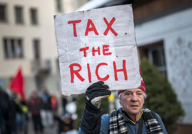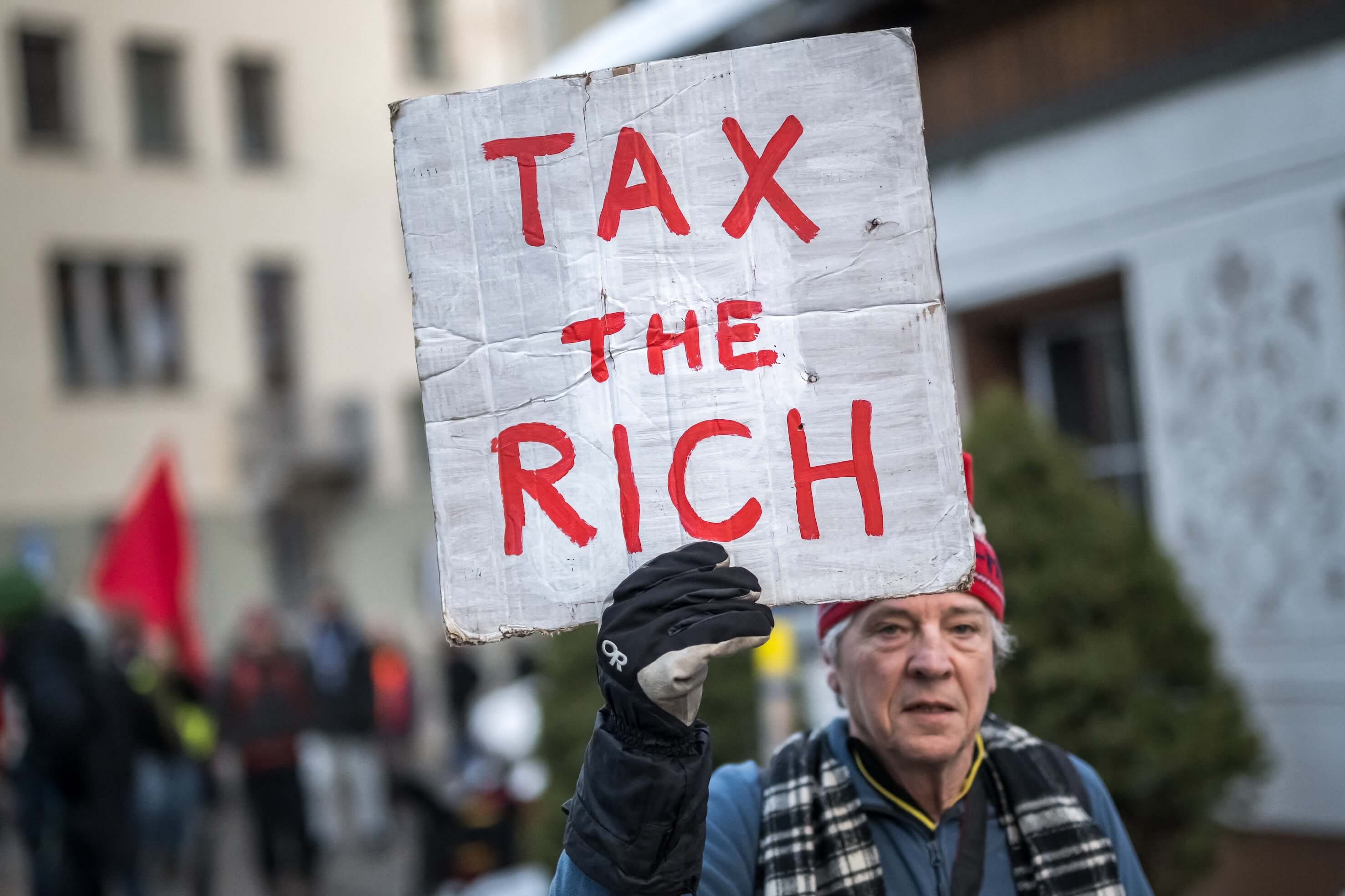 Ein Demonstrant fordert beim Weltwirtschaftsforum in Davos „Tax the Rich“. Oxfams jährlicher Bericht liefert die Zahlen zur passenden Empörung – Kritiker halten sie für irreführend.APA/AFP/Fabrice COFFRINI