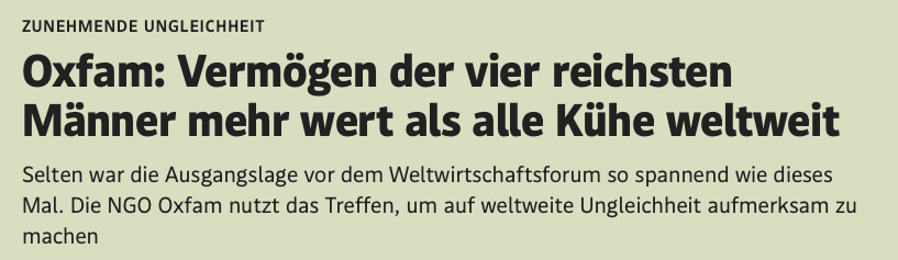 Zum Start des WEF in Davos lesen wir jedes Jahr um diese Zeit die gleiche Schlagzeile von Oxfam: „Milliardäre so reich wie nie – die halbe Welt arm.“