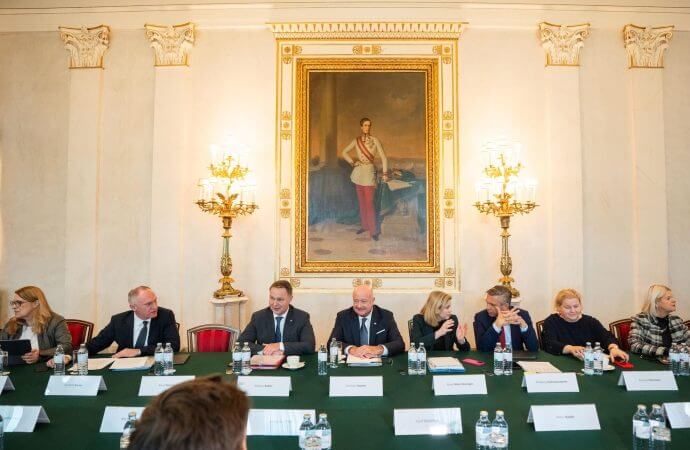 Gesundheitsstaatssekretärin Ulrike Königsberger-Ludwig (SPÖ), Innenminister Gerhard Karner (ÖVP), Vizekanzler Andreas Babler (SPÖ), Bundeskanzler Christian Stocker (ÖVP), Aussenministerin Beate Meinl-Reisinger (NEOS), Wirtschaftsminister Wolfgang Hattmannsdorfer (ÖVP), Sozialministerin Korinna Schumann (SPÖ) und Verteidigungsministerin Klaudia Tanner (ÖVP) am Mittwoch, 14. Jänner 2026, während eines Kameraschwenks anl. eines Ministerrats im Bundeskanzleramt in Wien.APA/GEORG HOCHMUTH