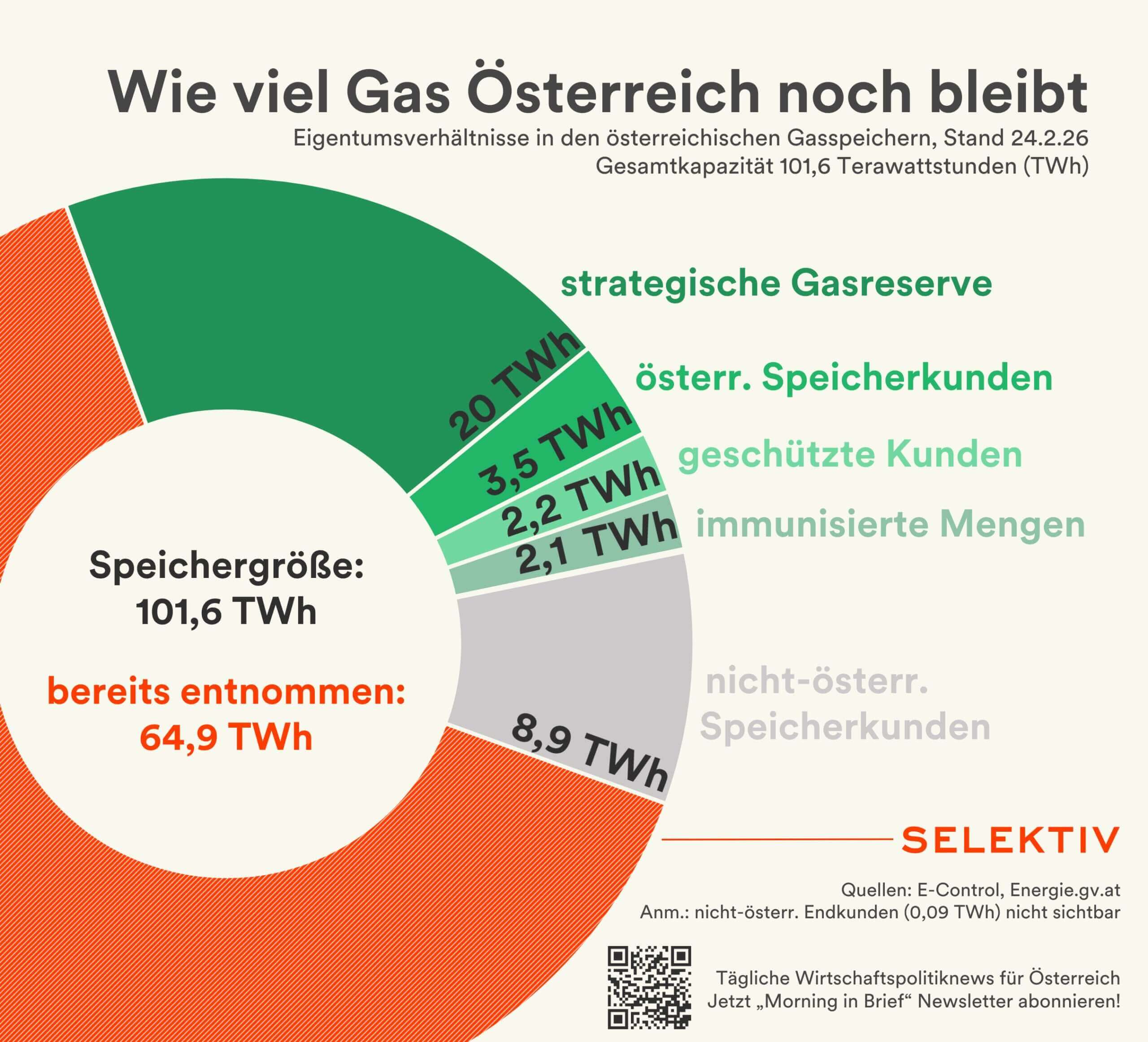Den größten Anteil bildet die strategische Gasreserve des Staates mit rund 20 TWh. Diese Menge wurde nach der Energiekrise aufgebaut, um im Notfall die Versorgung zu sichern. Laut Wirtschaftsminister Wolfgang Hattmannsdorfer würde diese Reserve ausreichen, um Österreich etwa zwei besonders kalte Wintermonate zu versorgen.