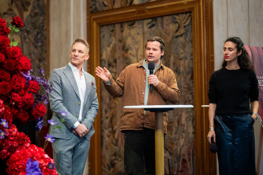 Moderator Andi Knoll, Emil Doll und Maryam Yeganehfar am Freitag, 16. Jänner 2026, im Rahmen einer PK zum 68. Wiener Opernball. APA/GEORG HOCHMUTH