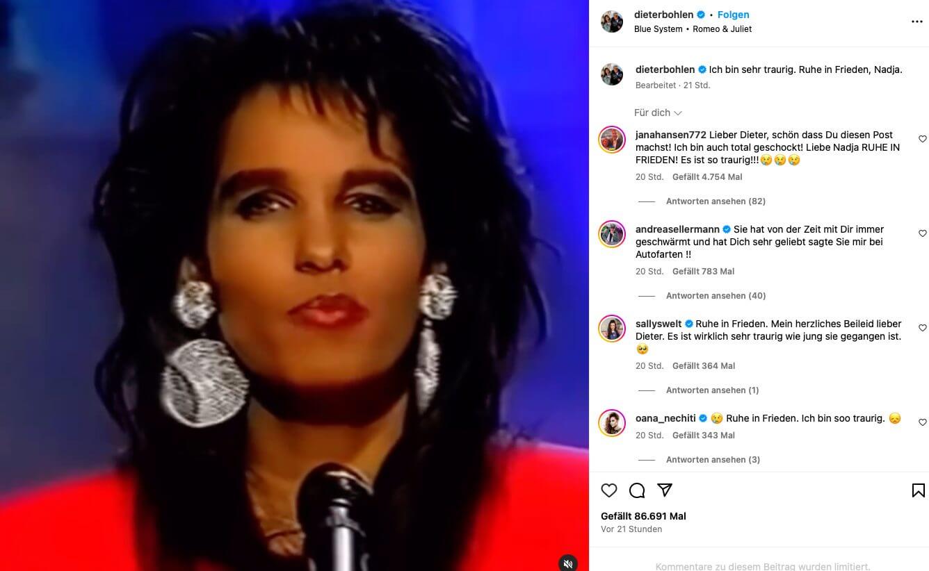 Zahlreiche Prominente von Jenny Elvers über Oliver Pocher bis hin zu Natascha Ochsenknecht haben in den sozialen Netzwerken ihre Bestürzung über das Ableben der Moderatorin und Sängerin („Weiße Pferde” mit Kurt Elsasser) Nadja Abd el Farrag zum Ausdruck gebracht. Nun meldete sich auch ihr Ex-Freund Dieter Bohlen zu Wort.