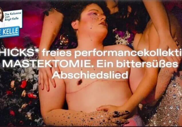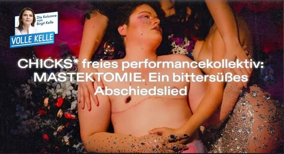 Gerade rüsten die Sophiensæle in Berlin als Veranstaltungsort für die Wiederaufnahme der Kunstperformance „CHICKS* freies performancekollektiv: MASTEKTOMIE. Ein bittersüßes Abschiedslied“. Eine laut Werbetext „Relaxed Performance“ bei der die Künstlerin Marietheres Mio Jesse den Abschied von ihren abgeschnittenen Brüsten gemeinsam mit dem Publikum in einer interaktiven Show begehen möchte. Ich zitiere: „Ölt unsere Narben, füllt unsere Badewanne mit Tränen, lasst uns die Lebenslust feiern und schmeißt euch in Schale. Herzlich willkommen zum feierlichen Abschiedsritual meiner Brüste, zum bittersüßen Neuanfang!“