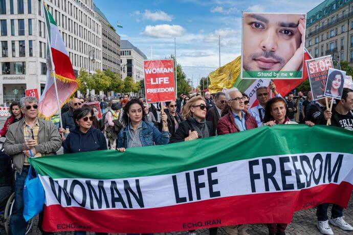 Ihr Tod löst die größte und längste Protestwelle seit Bestehen des Mullahregimes aus, sie kann die Herrschaft des Terrors aber ebenfalls nicht zu Fall bringen. Es gehen Bilder um die Welt von iranischen Frauen, die öffentlich ihre Hidschabs verbrennen und sich die Haare abschneiden. Es sind die Frauen im Iran, die mutig und trotzig den Protest vorantreiben und alles riskieren. Während im freien Westen das „Recht auf Kopftuchtragen“ reklamiert wird, kämpfen die Frauen im Iran darum, das erste Mal ihre Haare in der Öffentlichkeit frei im Wind wehen zu lassen. Auf Social Media verbreiten sich Videos mutiger Iranerinnen, die ihre Haare zeigen oder öffentlich singen (ebenfalls verboten). Das Abnehmen des Kopftuches und das Verbrennen des Hidschabs werden die neuen Erkennungszeichen des Widerstandes. Ihre Parole ist der Schlachtruf „Frau – Leben – Freiheit“.