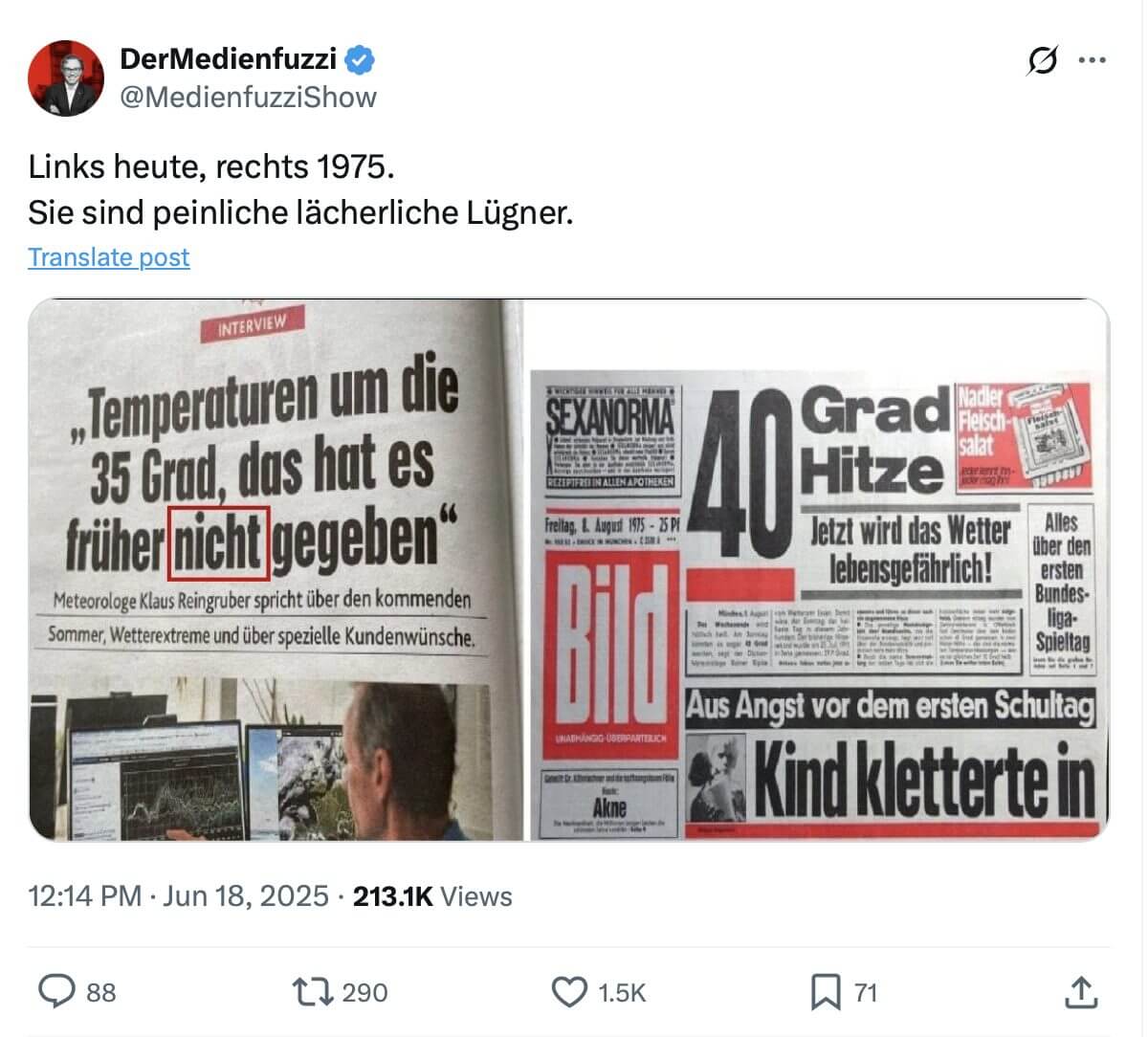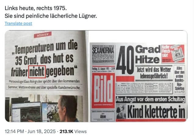 Im Juni 2022 ließ sich Meteorologe Klaus Reingruber in der Krone mit exakt dieser Behauptung zitieren – als wäre der Sommer eine neue Erfindung. Dabei reicht ein Blick ins Archiv, um die Absurdität dieser Aussagen zu entlarven. Schon 1975 wurden ähnliche Hitzewellen vorhergesagt, nur eben ohne grüne Dauerpanik und Tempolimitforderungen.
