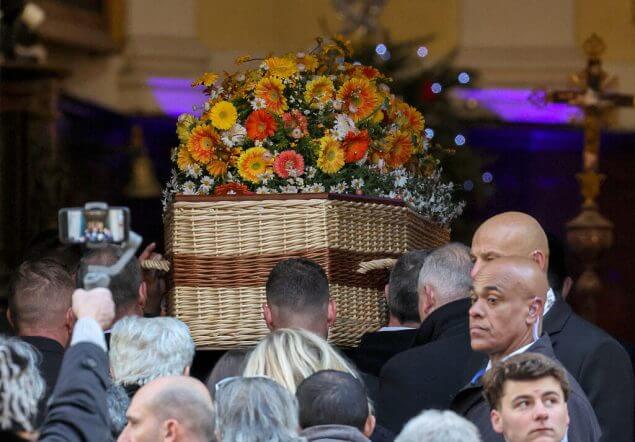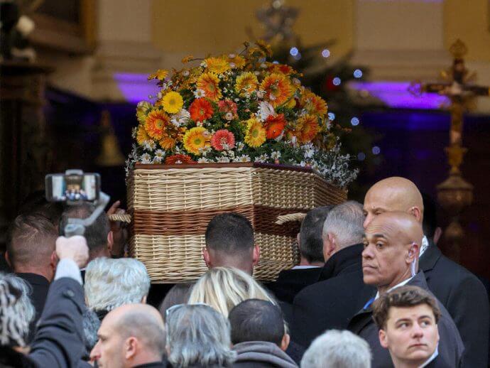 Der aus geflochtener Weide gefertigte Sarg in der Farbe von Treibholz, der mit ländlichen Blumen geschmückt war, traf um 11:15 Uhr an der Kirche ein. Der Pfarrer von Saint-Tropez zelebrierte die Messe und bat ausdrücklich darum, keine Fotos zu machen.