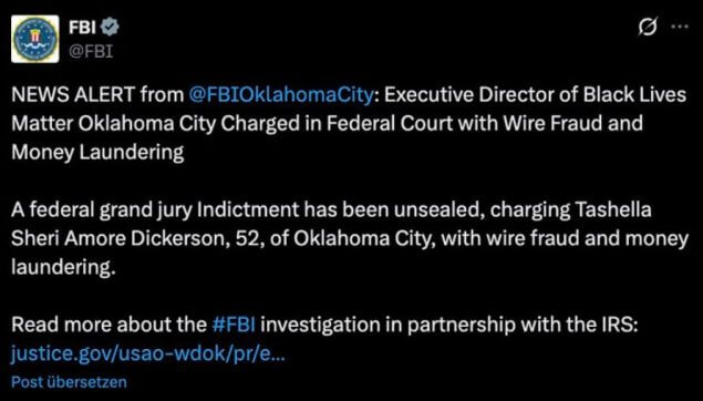 Die frühere Leiterin der Black-Lives-Matter-Bewegung (BLM) in Oklahoma City, Tashella Sheri Amore Dickerson, ist wegen schweren Finanzvergehen angeklagt worden. Bundesstaatsanwälte werfen der 52-Jährigen vor, über Jahre hinweg mehr als 3,15 Millionen Dollar an Spendengeldern und Fördermitteln veruntreut zu haben. Das Geld soll ursprünglich für Kautionsfonds und soziale Programme bestimmt gewesen sein, berichtet die New York Post.