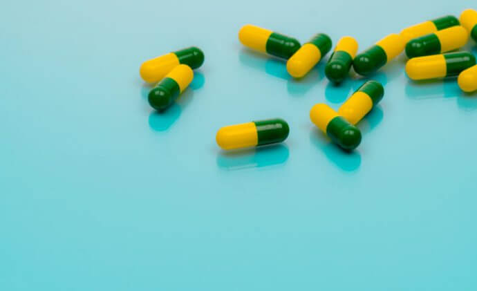 Tramadol Pillen. Grün-gelbe Kapselpillen auf blauem Hintergrund. Tramadol ist ein starkes Schmerzmittel zur Behandlung von mittelschweren bis starken Schmerzen. Hintergrund für Tramadol-Missbrauchsthemen.GETTYIMAGES/Fahroni