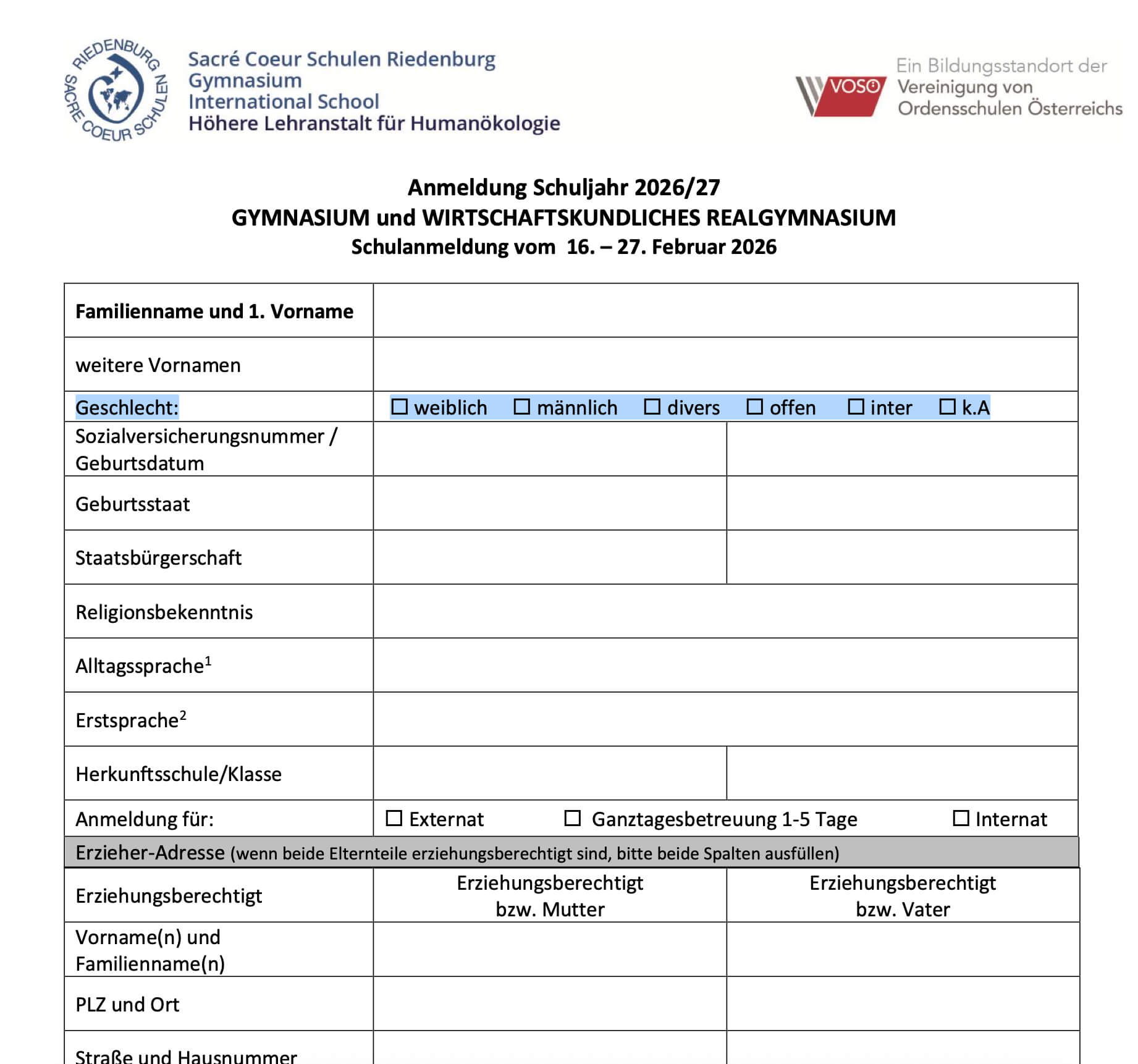Wollte man den späten Umstieg durch eine Inflation neuer Geschlechter kompensieren? In Pressbaum und Wien blieb man – ganz bieder – bei zwei Geschlechtern. Doch Eltern und Erziehungsberechtigte, die ihre Kinder beim Sacré Coeur Riedenburg anmelden, müssen nun zwischen fünf Geschlechtern wählen.