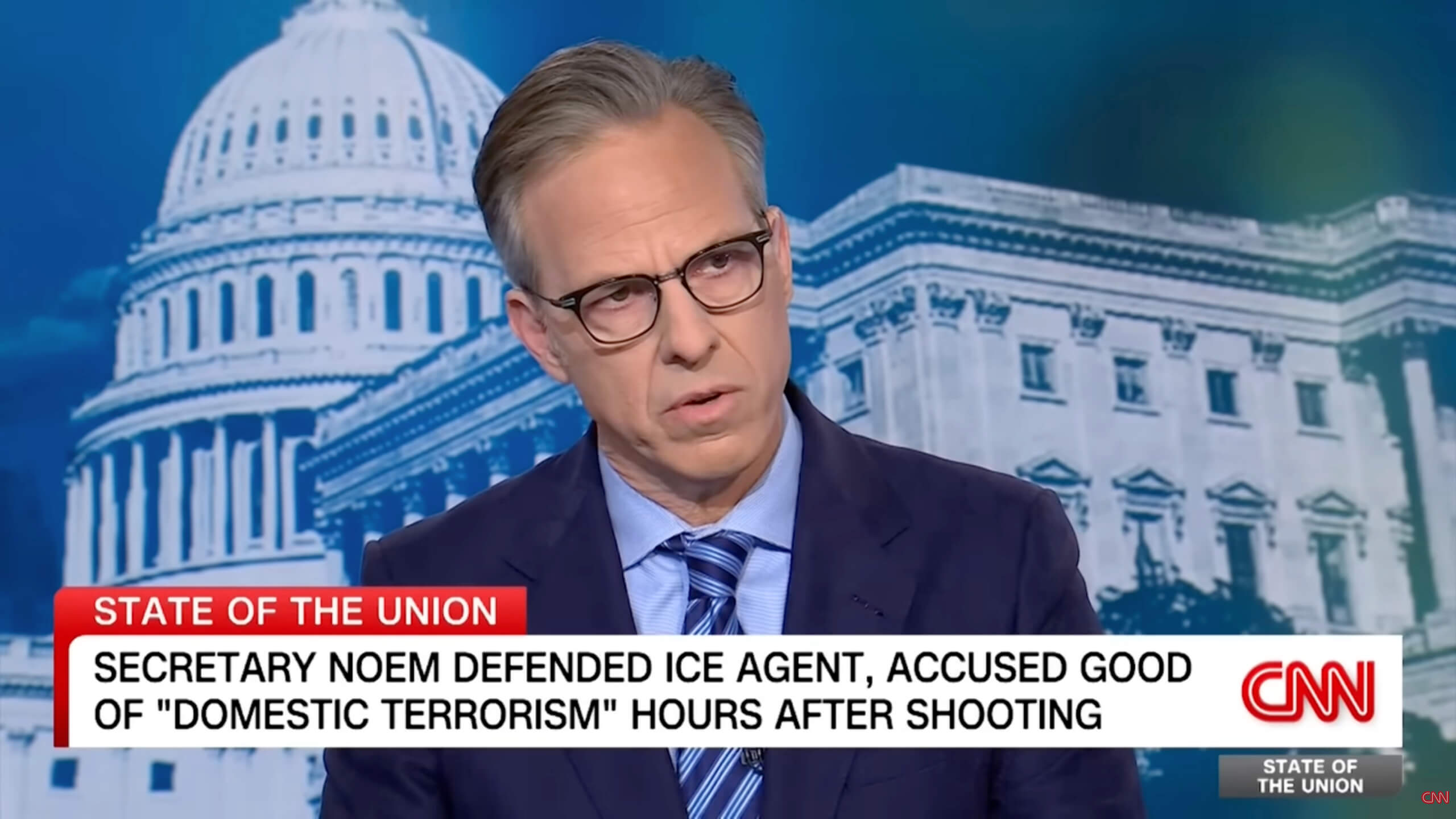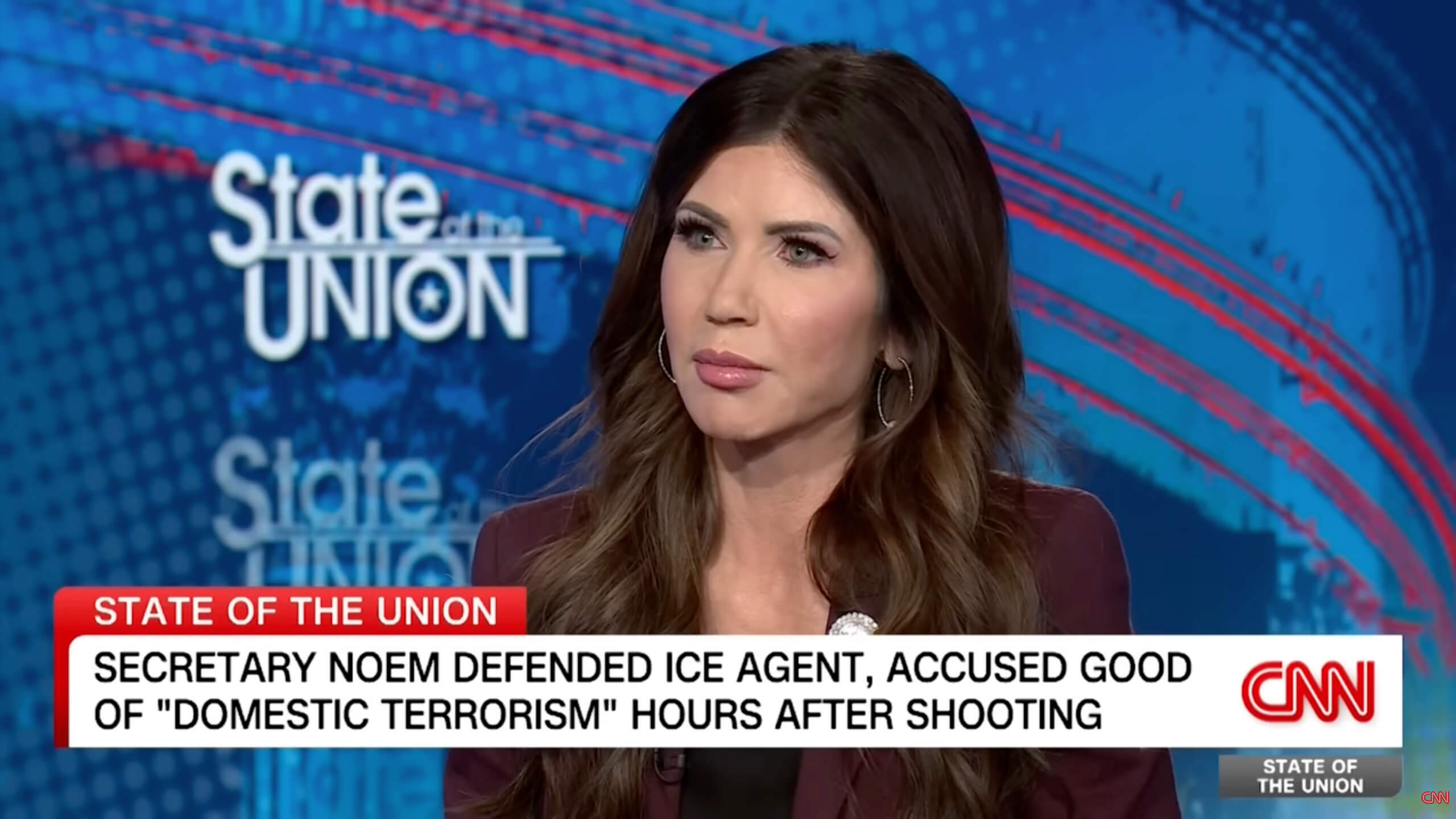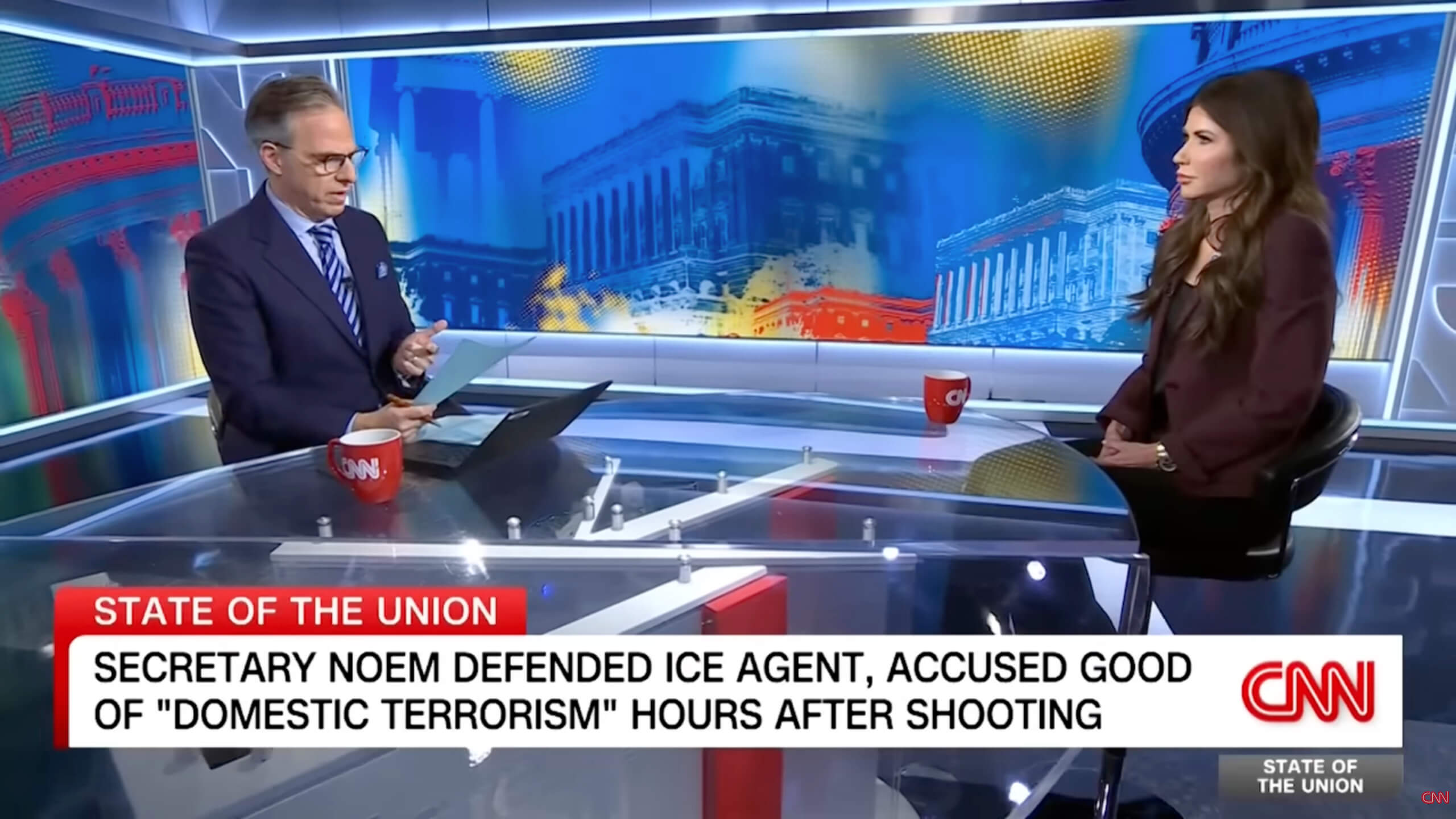 Tapper vertrat im Interview die These, Good habe möglicherweise lediglich wegfahren wollen. Noem widersprach vehement: Das Fahrzeug sei als Waffe eingesetzt worden, der Beamte habe sich verteidigt. Für sie sei der Sachverhalt eindeutig.