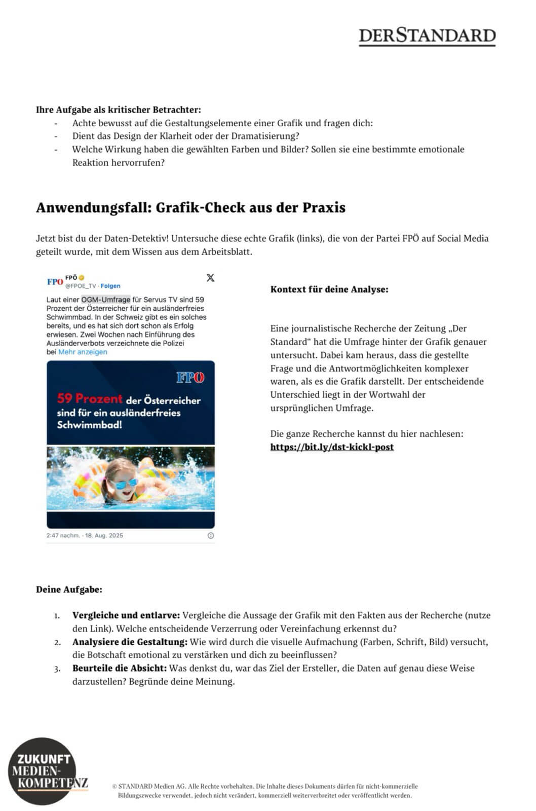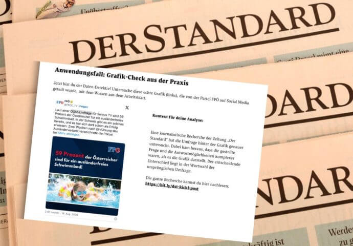 In einem Unterrichtsmaterial des Standard wird ein Social-Media-Posting der FPÖ analysiert, das sich auf eine ServusTV-Umfrage zum Thema „ausländerfreies Schwimmbad“ bezieht. Ausgangspunkt waren Berichte über ein Schweizer Freibad, das Ausländern den Zutritt verwehrte. Die FPÖ griff das Thema auf und verwies auf eine OGM-Umfrage im Auftrag von ServusTV, wonach 59 Prozent der Befragten Verständnis für die Maßnahme in der Schweiz zeigten. Im Posting wurde daraus der Eindruck erweckt, als befürworte die Mehrheit ein generelles „ausländerfreies Schwimmbad“ – eine Zuspitzung, die so nur teilweise aus den Umfrageergebnissen hervorgeht.