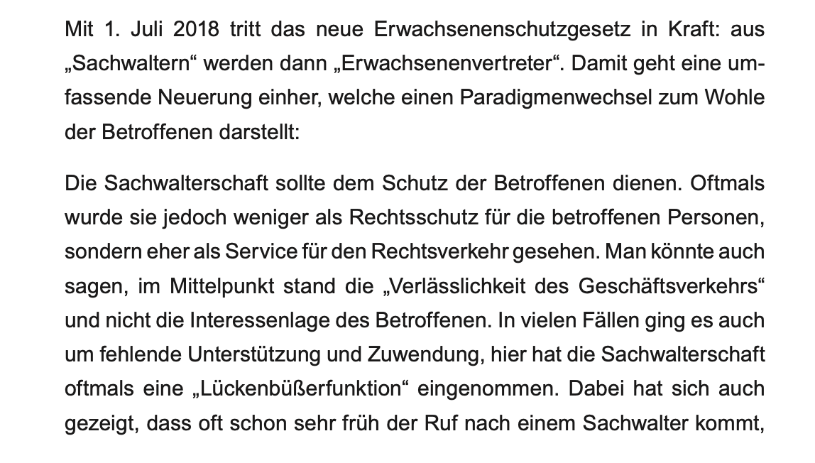 Die Erwachsenenvertretung ersetzt seit 2018 die frühere Sachwalterschaft. Die Reform war eine Reaktion auf massive Kritik der UNO, die Österreich gravierende Mängel im Umgang mit schutzbedürftigen Erwachsenen attestiert hatte. Das Ziel: mehr Selbstbestimmung, weniger Fremdbestimmung. Angehörige sollten gestärkt, Vereine ausgebaut, Anwälte nur noch als Notlösung eingesetzt werden.