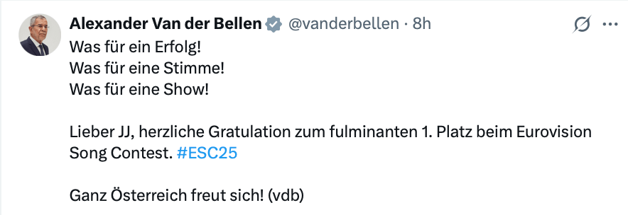 Bundespräsident Alexander Van der Bellen gratulierte JJ jedenfalls bereits via X: “Was für ein Erfolg! Was für eine Stimme! Was für eine Show! Lieber JJ, herzliche Gratulation zum fulminanten 1. Platz beim Eurovision Song Contest.” Zuvor hatte bereits Bundeskanzler am selben Kanal seiner Freude freien Lauf gelassen: “Was für ein großartiger Erfolg – meine herzlichsten Glückwünsche zum Sieg. […] JJ schreibt heute österreichische Musikgeschichte!”