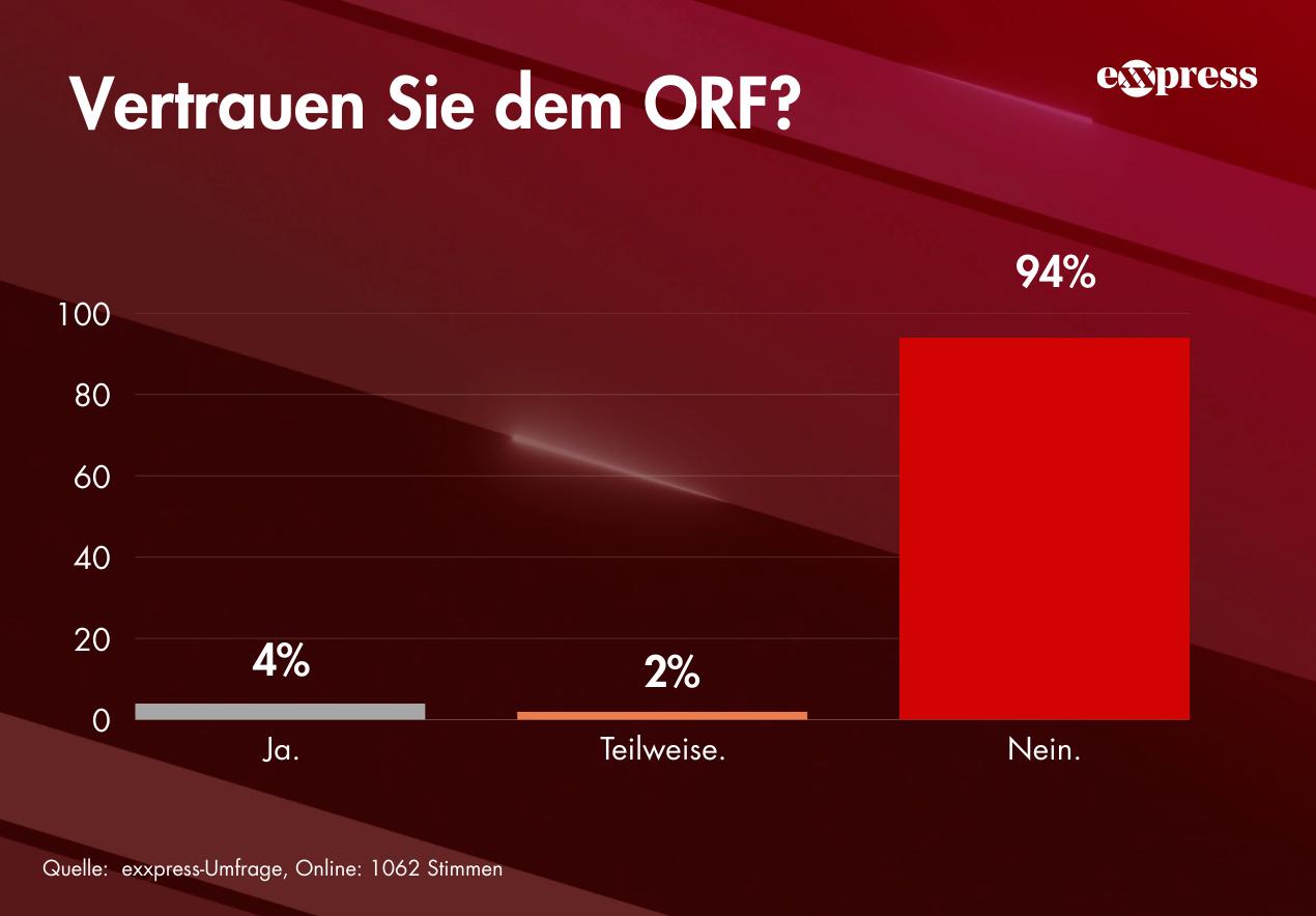 Auf die Frage „Vertrauen Sie dem ORF?“ antworteten 94 % der Teilnehmer mit „Nein“. Nur 4 % gaben an, dem ORF zu vertrauen, während 2 % erklärten, sie hätten zumindest teilweise Vertrauen.