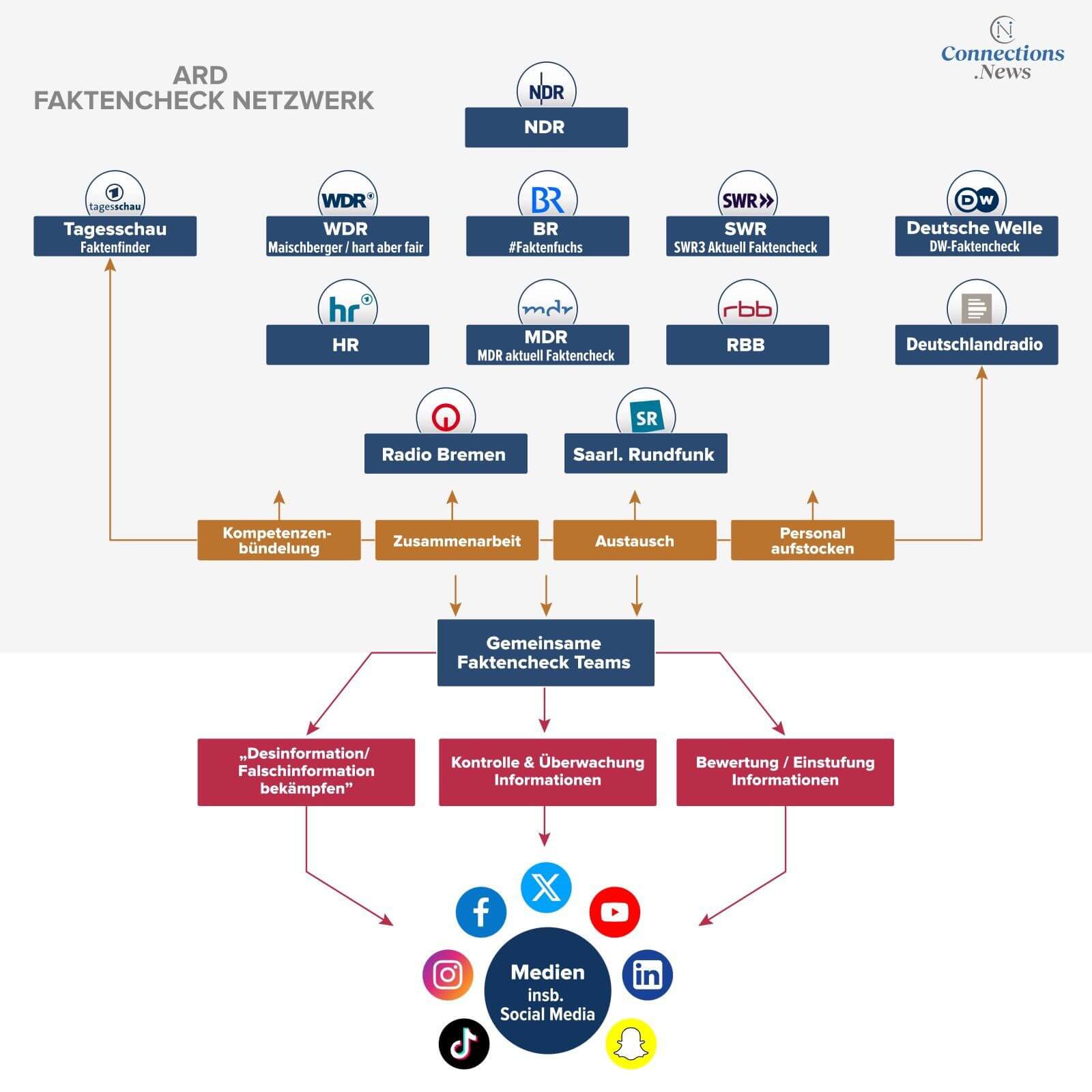 „Die ARD erweitert ihre Kapazitäten gegen Desinformation“, erklärte NDR-Programmdirektor Frank Beckmann bei der Ankündigung des Projekts. Hintergrund dieser Maßnahme ist unter anderem die zunehmende Verbreitung von Fehlinformationen in sozialen Medien und die Notwendigkeit, diesen entgegenzuwirken. Doch warum musste ein weiteres Netzwerk gegründet werden, wenn bereits Faktencheck-Redaktionen wie der „Faktenfinder“ der ARD, die „Faktenfüchse“ des Bayerischen Rundfunks oder die SWR3-Redaktion zur Aufklärung von Fake News existieren?