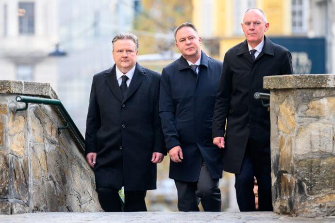 v.l. Wiens Bürgermeister Michael Ludwig (SPÖ), Vizekanzler Andreas Babler (SPÖ) und Innenminister Gerhard Karner (ÖVP) im Rahmen einer Kranzniederlegung anlässlich des Terroranschlags am 2. November 2020, am Sonntag 2. November 2025 in Wien.APA/MAX SLOVENCIK
