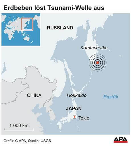 Die stärkste Welle sei fünf Meter hoch gewesen, berichtete die staatliche russische Nachrichtenagentur RIA Nowosti am Mittwoch. Ein Tsunami habe auch die japanische Insel Hokkaido erreicht, berichtete der Rundfunksender NHK. Im Pazifik-Raum wurden erste Tsunami-Warnungen wieder herabgestuft.