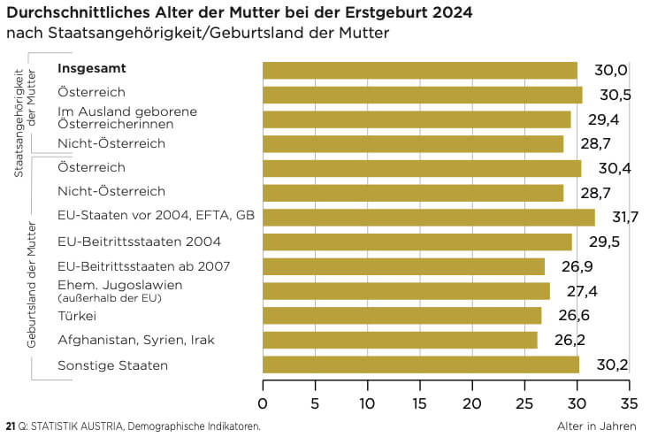 Nicht nur die Kinderzahl, auch das Alter bei der Geburt unterscheidet sich stark: In Österreich geborene Mütter sind im Schnitt 30,4 Jahre alt, bei im Ausland geborene Frauen beträgt das Durchschnittsalter hingegen 28,7 Jahre.