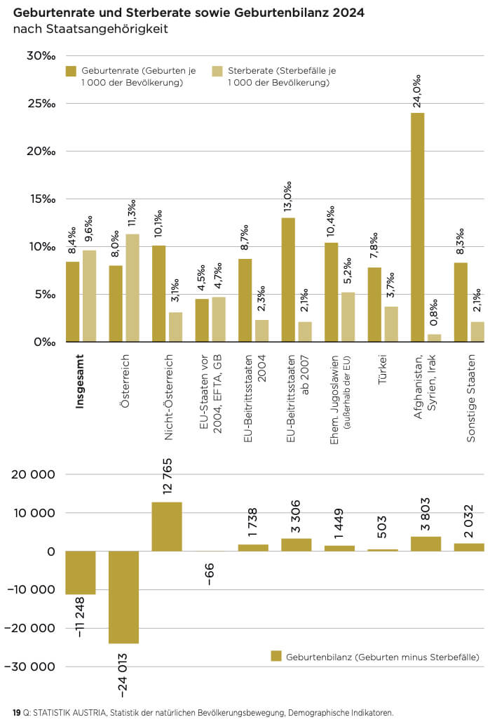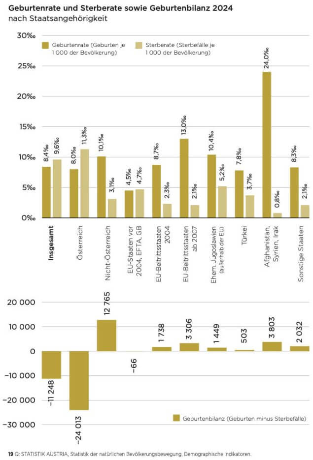 Junge Migrantinnen mit hoher Kinderzahl prägen die Bevölkerungsentwicklung – nicht spätgebärende Österreicherinnen oder West-Europäerinnen. Der demografische Saldo – also Geburten minus Todesfälle – ist nur bei Migrantengruppen positiv. Besonders Österreicher über 50 sterben häufiger, ohne durch Geburten ersetzt zu werden. Neben Einwanderung ist also auch Reproduktion ein Hauptfaktor.