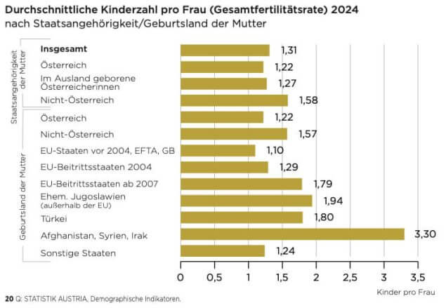 Die Zuwanderinnen der letzten 10 bis 15 Jahre sind heute im gebärfähigen Alter – und sie bekommen Kinder. Viele Österreicher hingegen nicht. Damit wird Österreichs Zukunft zunehmend von Zuwanderern geprägt. Menschen aus Afghanistan, Syrien, dem Irak und Teilen Osteuropas werden einen größeren Teil der heimischen Bevölkerung ausmachen. Wer die Augen vor dieser Realität verschließt, wird die gesellschaftlichen, bildungspolitischen und integrationspolitischen Herausforderungen der kommenden Jahrzehnte nicht lösen können.