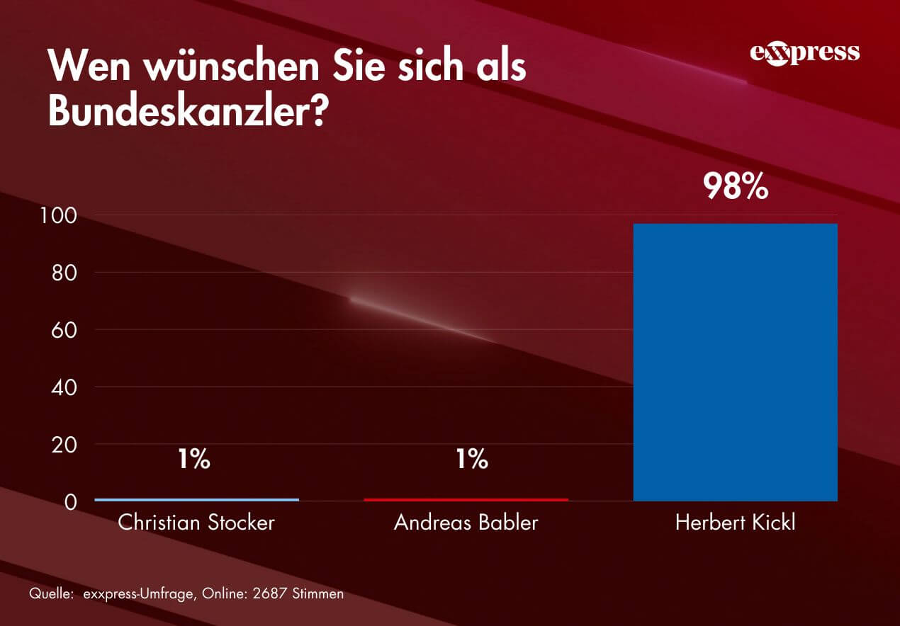 In einer aktuellen Exxpress-Umfrage kristallisiert sich ein eindeutiger Favorit für das Amt des österreichischen Bundeskanzlers heraus: FPÖ-Chef Herbert Kickl. Laut der Erhebung sprechen sich beeindruckende 98 Prozent der teilnehmenden Leser für Kickl aus. 2687 Personen haben dabei online abgestimmt.
