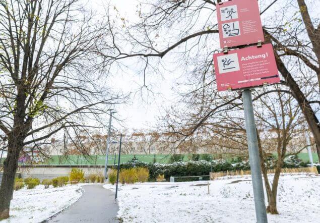 Blick auf eine Hinweistafel, aufgenommen am Sonntag, 23. November 2025, in Wien. Das Wetter bleibt vorerst winterlich.APA/TOBIAS STEINMAURER