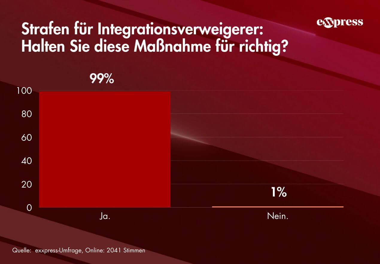 In einer neuen Umfrage unter den Zusehern von exxpress Live wurde gefragt, ob Strafen für Integrationsverweigerer die richtige Maßnahme seien. Die Antwort der Zuschauer fällt eindeutig aus.