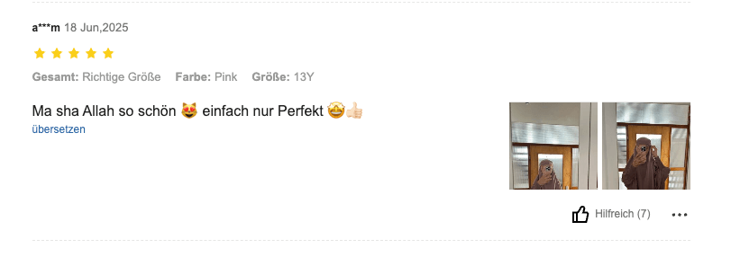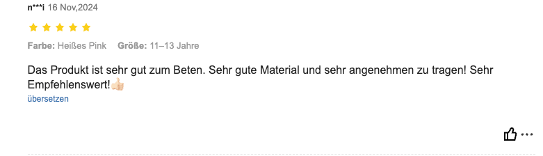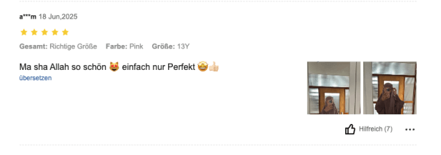 Ein rosa geblümtes Ganzkörperkleid für 11,68 Euro etwa wird in Größen für 4- bis 6-Jährige, 5- bis 7-Jährige, 8- bis 10-Jährige, 11- bis 13-Jährige und 13- bis 14-Jährige angegeben. Die Kundenbewertungen fallen fast überwiegend positiv aus. Ein begeisterter Käufer schreibt: „sehr schön meine Tochter gefällt es und ist ein angenehmes Stoff sie ist immer motiviert damit zu beten“. Jemand anderer kommentiert: „Das Produkt ist sehr gut zum Beten“.