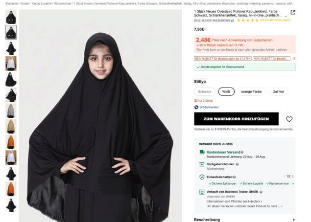Während die Bundesregierung ein Kopftuchverbot für Mädchen unter 14 Jahren an Schulen plant, bietet der chinesische Fast-Fashion-Gigant Shein Hijabs für Kinder an. Doch nicht nur das: Auch Chadors, also lange Kleidungsstücke, die den gesamten Körper mit Ausnahme des Gesichts bedecken, sind über den österreichischen Ableger in Kindergrößen zu kaufen.