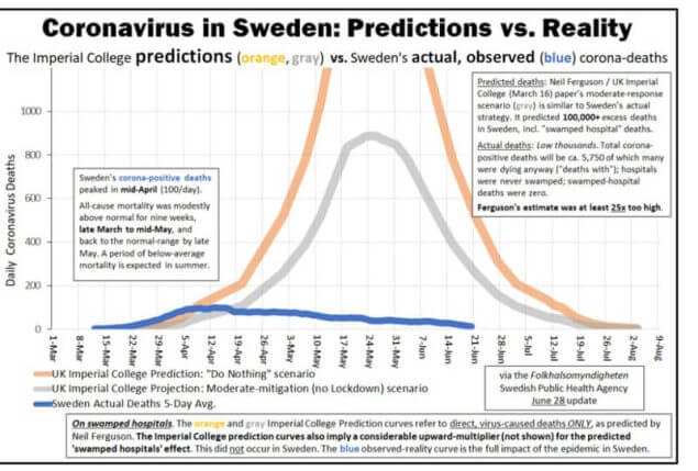 So hatte man für Schweden verschiedene mögliche Szenarien berechnet, wie viele Tote zu erwarten waren. Die orangefarbene Kurve in der folgenden Grafik bildet das Szenario ab, das man für den Fall erwartete, dass Schweden die Ausbreitung der Infektionen komplett ohne Maßnahmen zulassen würde. Die graue Linie symbolisiert den erwarteten Verlauf der Todeszahlen im Fall von milden Maßnahmen – also eben jenem Vorgehen, das Schweden wählte. Die blaue „Kurve“ zeigt den tatsächlichen Verlauf der schwedischen Todesfälle. Die Vorhersage lag damit fast um den Faktor 75 zu hoch.