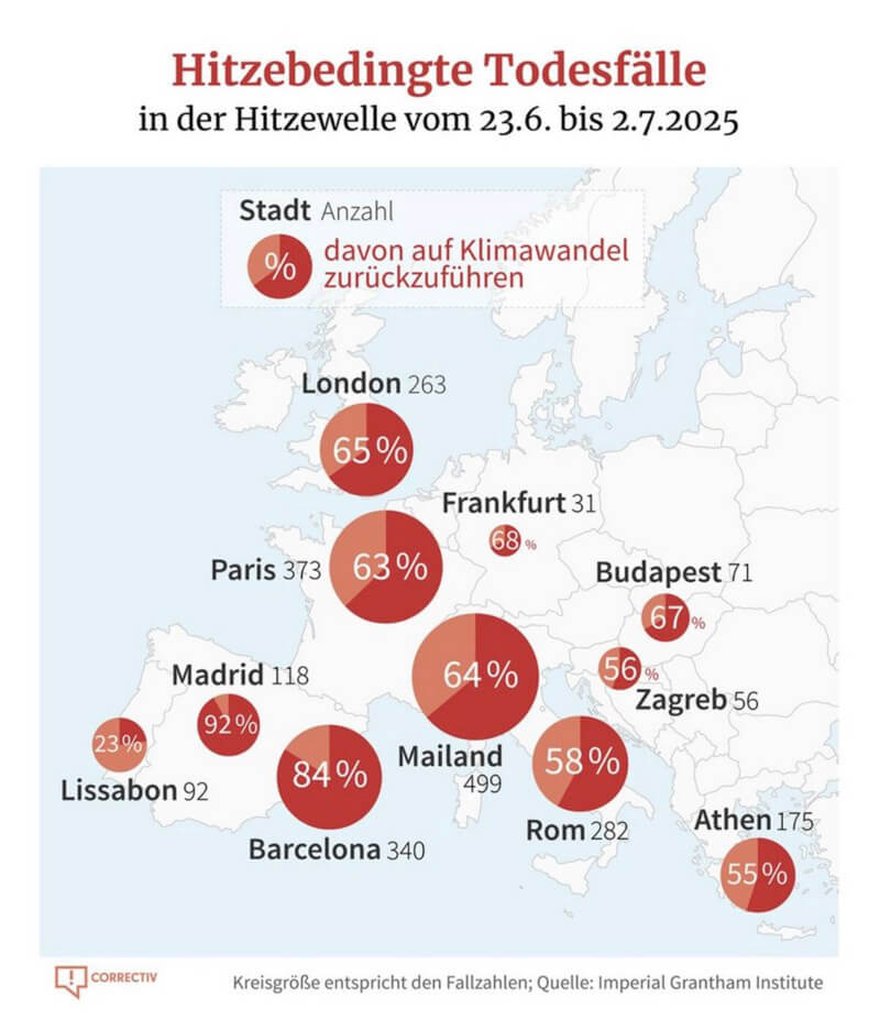 Die Wissenschaftler hatten zwölf europäische Städte untersucht: Der Modellierung zufolge entfielen knapp 320 der durch den Klimawandel zusätzlich entstandenen Todesfälle auf Mailand, 286 auf Barcelona, 235 auf Paris und 171 auf London. In Frankfurt liege die Zahl mit 21 zusätzlichen Todesopfern vergleichsweise niedrig, hieß es. „Hitzewellen hinterlassen keine Schneise der Verwüstung wie Flächenbrände oder Stürme“, wird Co-Autor Ben Clarke vom Imperial College London von der dpa zitiert. „Ihre Folgen sind überwiegend unsichtbar, aber im Stillen verheerend. Eine Differenz von nur 2 bis 3 Grad Celsius kann für Tausende von Menschen den Unterschied zwischen Leben und Tod bedeuten.“