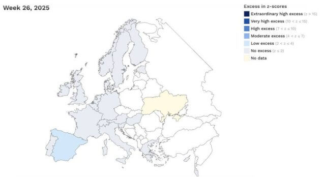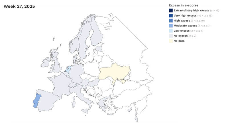 So gab es in der Kalenderwoche 26 (also vom 23. bis 29. Juni) eine leichte Übersterblichkeit in Spanien, in der folgenden 27. Kalenderwoche vom 30. Juni bis zum 6. Juli dann eine moderate in Portugal und eine leichte in den Niederlanden. In allen anderen europäischen Ländern starben den erhobenen Daten zufolge nicht mehr Menschen, als zu erwarten gewesen wäre.