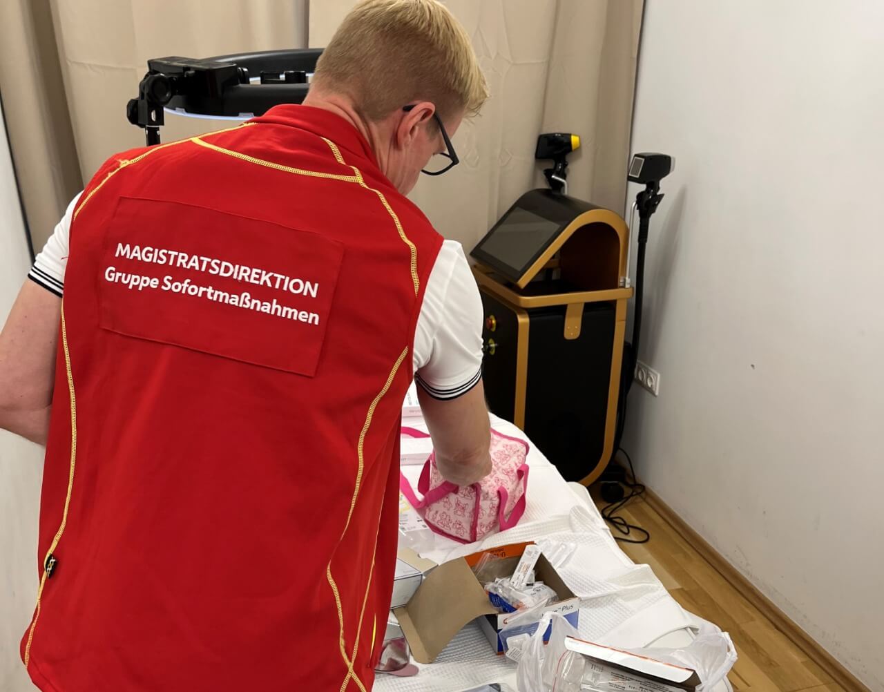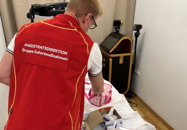 Ein Mitarbeiter der Gruppe Sofortmaßnahmen der Magistratsdirektion, mit einem Teil der medizinischen Produkte, am Samstag, 02. August 2025.APA/GRUPPE SOFORTMASSNAHMEN