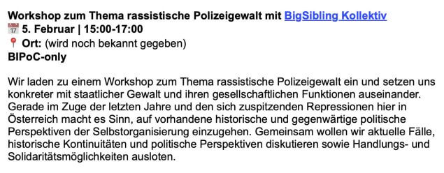 Konkret geht es um eine Sonderaussendung der ÖH zum „Black History Month“, die an alle Studenten der Uni Wien verschickt wurde, unabhängig davon, ob sie überhaupt zu den Teilnehmern gehören. Darin werden mehrere Events im Februar angekündigt, etwa ein „Workshop zum Thema rassistische Polizeigewalt (BIPoC-only)“ sowie der gemeinsame Besuch der Performance ANTI-MUSE – to those yet to come, ausdrücklich ausgewiesen als „Black Students only“.