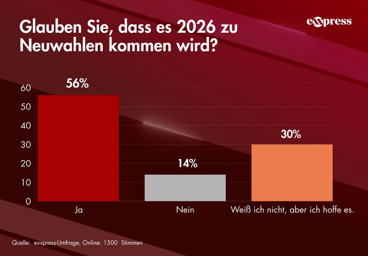In der aktuellen exxpress-Online-Umfrage antworteten 56 % der Teilnehmer mit „Ja“, sie seien überzeugt, dass es im Jahr 2026 zu Neuwahlen kommen werde. Ein weiterer großer Teil (30 %) gab an, nicht sicher zu sein – sagte aber ausdrücklich, dass er daran hofft. Nur 14 % verneinten die Frage.