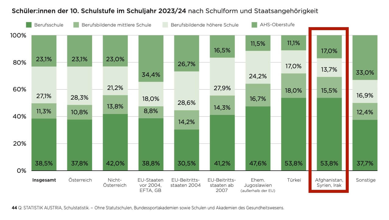 In der zehnten Schulstufe besucht in Österreich insgesamt fast die Hälfte der Jugendlichen eine AHS oder BHS: 23,1 Prozent gehen in die AHS-Oberstufe, 27,1 Prozent in eine berufsbildende höhere Schule, 38,5 Prozent in die Berufsschule. Ganz anders bei Schülern aus Syrien, Afghanistan und Irak: Nur 17 Prozent schaffen es in die AHS, dafür landen 53,8 Prozent in der Berufsschule.