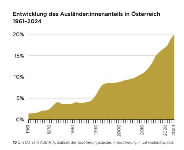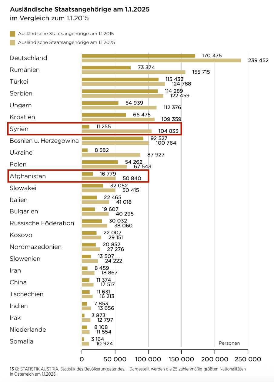 Tatsächlich sind die Zahlen eindrucksvoll: Jeder fünfte Mensch in Österreich hat bereits eine ausländische Staatsbürgerschaft – ein historisches Allzeithoch. Vor zehn Jahren waren es noch 15 Prozent. Besonders Afghanen und Syrer wuchsen rasant: auf 105.000 Syrer und 51.000 Afghanen zu Jahresbeginn.