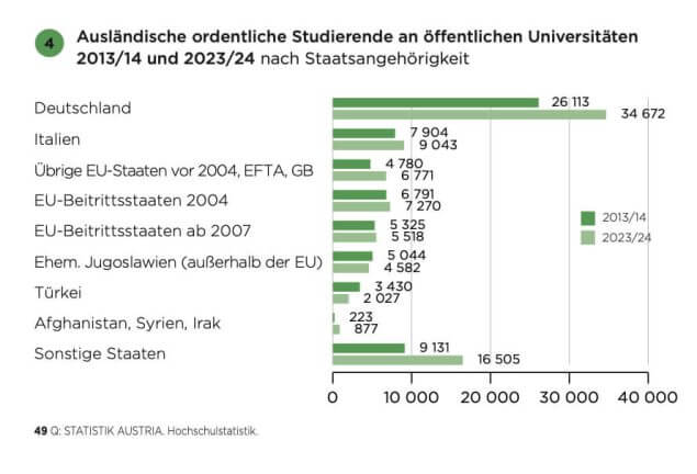 An den Universitäten setzt sich das Bild fort. Unter den ausländischen ordentlichen Studenten dominieren 2023/24 klare Bildungsgewinner: 34.672 kommen aus Deutschland, 9.043 aus Italien, rund 7.000 aus osteuropäischen EU-Staaten. Syrer, Iraker und Afghanen stellen demgegenüber gerade einmal 877 Studenten – das sind 0,8 Prozent aller ausländischen Studierenden, obwohl inzwischen Hunderttausende Menschen aus diesen Ländern in Österreich leben.