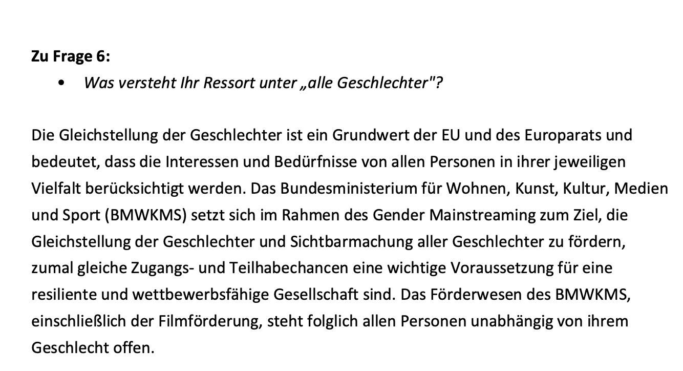 Die Antwort des zuständigen Ministeriums bleibt dabei bewusst nüchtern und formal. Der Film „Mädchen Mädchen“ sei im Rahmen der automatischen Standortförderung ÖFI+ unterstützt worden, eine inhaltliche Bewertung durch die Bundesregierung sei nicht vorgesehen. Entscheidend sei allein das Bestehen eines sogenannten kulturellen Eigenschaftstests, den der Film mit 66 von mindestens 51 erforderlichen Punkten erfüllt habe.
