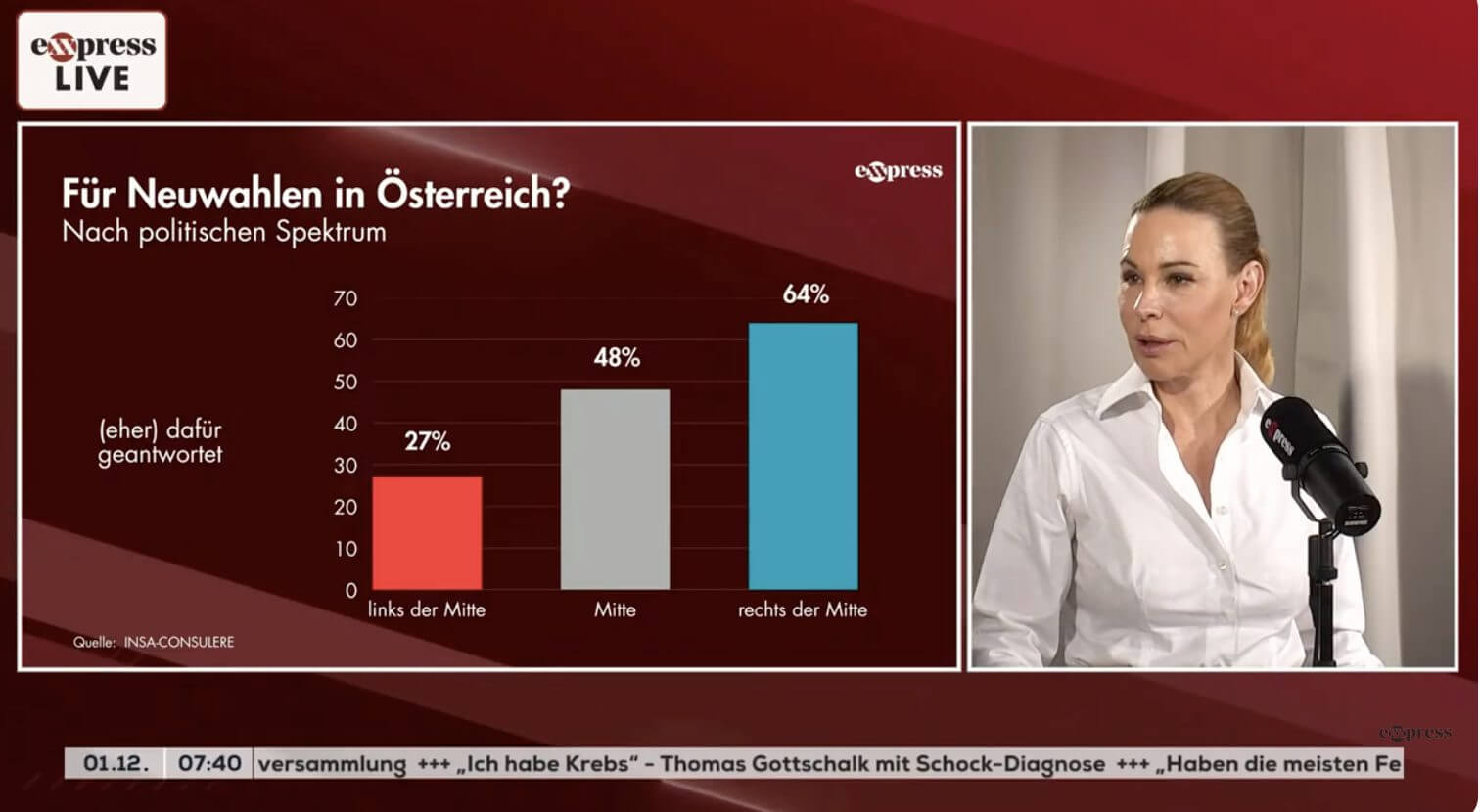 In der heutigen exxpress live Sendung wurde kontrovers über den Wunsch nach Neuwahlen und den Höhenflug der FPÖ diskutiert – mit dabei: Herausgeberin Eva Schütz und Politologe Ralf Schöllhammer. Auslöser war eine frische Umfrage, die der Regierung ein miserables Zeugnis ausstellt.