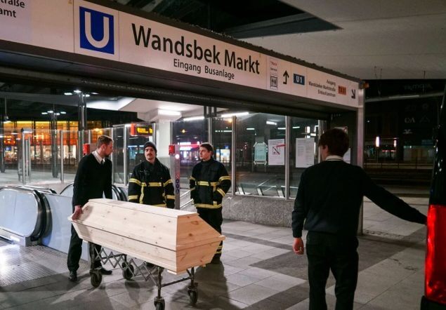 Die einfahrende U-Bahn konnte nicht mehr rechtzeitig bremsen. Die beiden Toten wurden in der Nacht in Holzsärgen über die Rolltreppen aus der U-Bahn gebracht.