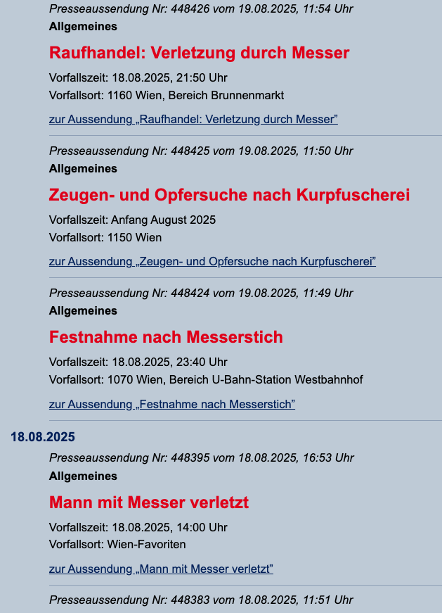 Sie gehören mittlerweile zu Österreichs Alltag wie das Amen im Gebet: Die täglichen Messerstechereien. Mit der Berichterstattung kommen die Medien gar nicht mehr nach, mehrmals täglich finden in Wien am Westbahnhof und in den neuen Waffebverbotszonen wie Yppenplatz oder der Messer-Hochburg Favoriten „Einzelfälle” statt.