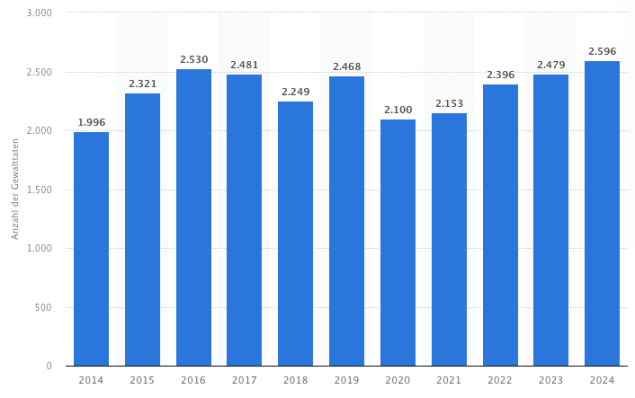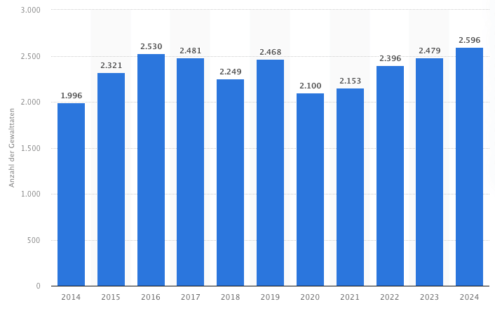 Kurz zum Abschluss ein Blick auf die polizeilichen Kriminalstatistik. „Im Jahr 2024 wurden in Österreich rund 2.600 Gewalttaten bei der Polizei zur Anzeige gebracht, bei denen Stichwaffen verwendet, mitgeführt oder deren Einsatz angedroht wurden. Damit stieg die Zahl der Gewaltdelikte mit Messern das vierte Jahr in Folge und auf den höchsten Stand im Beobachtungszeitraum”, so nachzulesen auf statista.com. Die Zunahme der Stichwaffen-Gewalttaten wird mit einer Statistik visuell dargestellt, Beginn ist 2014, ab 2015 gehen die Messerattacken in die Höhe (siehe Bild). Sogar im Corona-Lockdown-Jahr gab es mehr Messerstechereien als vor 2015.