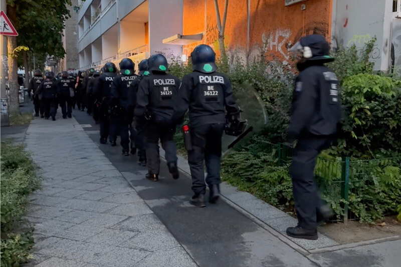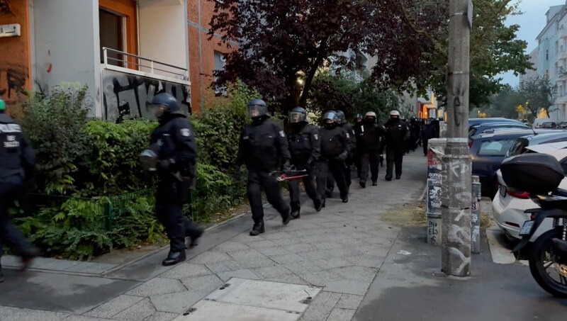 „Wir sind hier mit technischen Spezialkräften heute Morgen aufgetaucht, weil wir das Szeneobjekt Rigaer 94 natürlich schon seit mehreren Jahren kennen. Die Türen sind in der Regel besonders gesichert durch diejenigen, die sich hier in dem Gebäude aufhalten. Und deshalb haben wir hier technisches Spezialgerät angewandt. Das heißt, wir haben die Zugangstüren aufgeflext und auch Einsatzrammen eingesetzt, um uns hier Zugang in das Objekt zu verschaffen.“