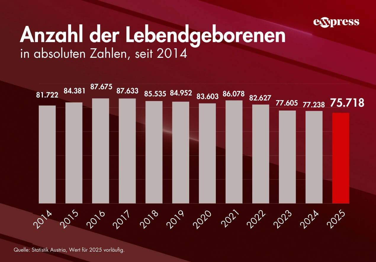 Doch in Österreich fällt die Dynamik besonders ins Auge: Der Absturz seit 2021 ist stärker als in vielen vergleichbaren Ländern. Im vergangenen Jahr kamen nur 75.718 Kinder zur Welt – ein historischer Tiefstand.