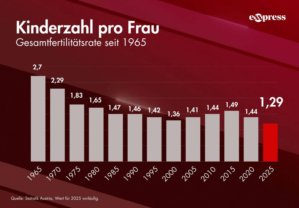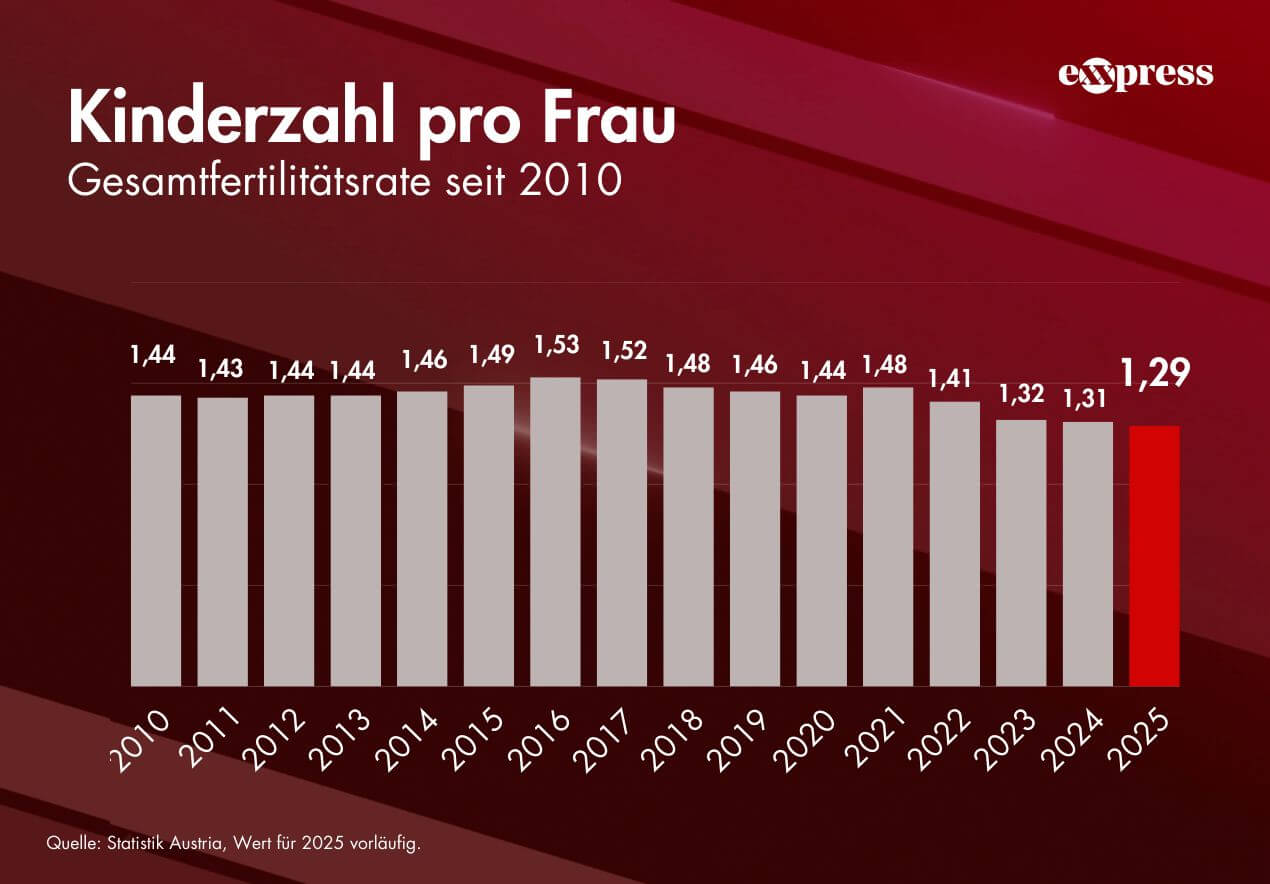 So wenige Kinder wie noch nie: Mit 1,29 Kindern pro Frau ist die Geburtenrate 2025 in Österreich auf ein historisches Tief gefallen. Seit Beginn der Aufzeichnungen lag der Wert nie niedriger. Zum Vergleich: Für eine stabile Bevölkerungsentwicklung wären rund 2,1 Kinder pro Frau nötig.